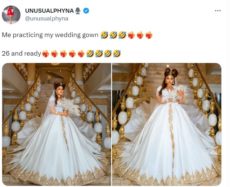 Sharing photos of herself wearing a wedding gown, Phyna wrote, “Me practicing in my wedding gown. 26 and ready.”