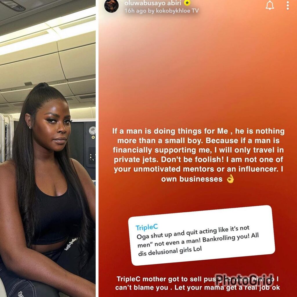 “If a man is doing things for Me, he is nothing more than a small boy. Because if a man is financially supporting me, I will only travel in private jets. Don’t be foolish! I am not one of your unmotivated mentors or an influencer. I own businesses.