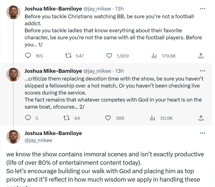 “Before you tackle Christians watching BB, be sure you’re not a football addict. Before you tackle ladies that know everything about their favorite character, be sure you’re not the same with all the football players. Before you criticize them replacing devotion time with the show, be sure you haven’t skipped a fellowship over a hot match, Or you haven’t been checking live scores during the service.