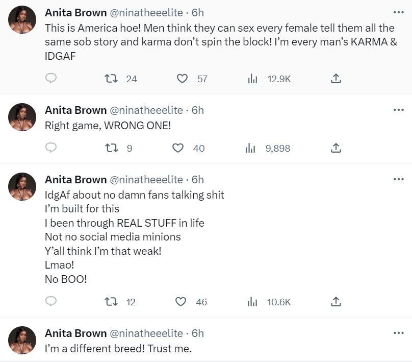 “I’m a different breed! Trust me. I don’t give a fuck about any damn fans talking shit. I’m built for this. I’ve been through REAL STUFF in life, not some social media minions. Y’all think I’m that weak! Lmao! No, BOO! This is America, hoe! Men think they can have sex with every female and tell them all the same sob story, but karma don’t spin the block! I’m every man’s KARMA & IDGAF,” she wrote on Twitter.