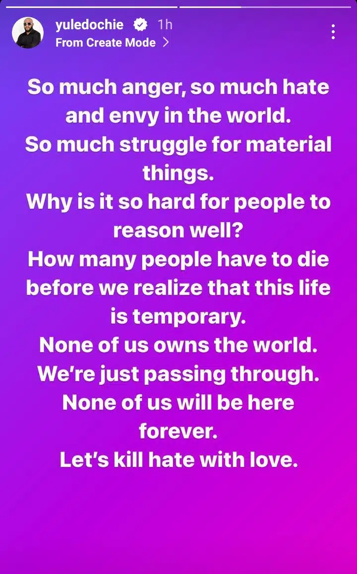 “How many people have to die before we realize that this life is temporary. Let’s kill hate with love” – Yul Edochie