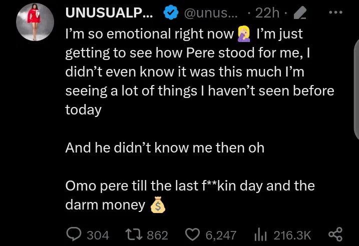 I’m so emotional right now. I’m just getting to see how Pere stood for me, I didn’t even know it was this much I’m seeing a lot of things I haven’t seen before today.”