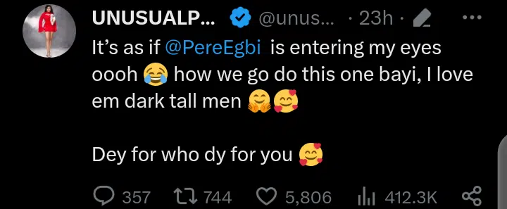 “It’s as if @PereEgbi is entering my eyes oooh how we go do this one bayi, I love em dark tall men. Dey for who dy for you.”