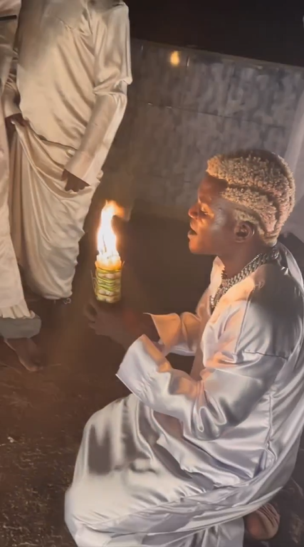 In a video shared on his Instagram page, Portable can be seen performing a religious ritual at night while dressed in white.