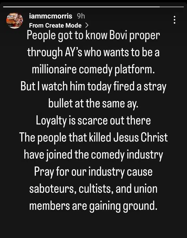 “People got to know Bovi proper through AY’s who wants to be a millionaire comedy platform. But I watch him today fired a stray bullet at the same ay. Loyalty is scarce out there The people that killed Jesus Christ have joined the comedy industry Pray for our industry cause saboteurs, cultists, and union members are gaining ground.” He wrote.