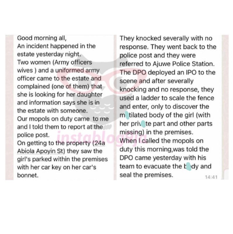 An insider who relayed the incident in the estate’s WhatsApp group disclosed that the late influencer’s corpse was found with her private part and other organs missing.