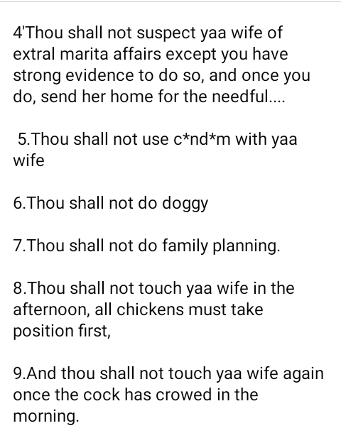 4’Thou shall not suspect yaa wife of extral marital affairs except you have strong evidence to do so, and once you do, send her home for the needful….