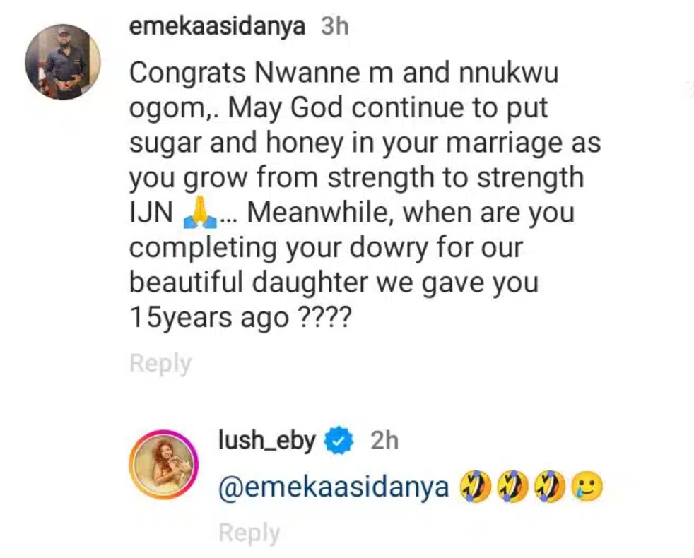 A follower, who also congratulated the celebrity couple, playfully asked Obi Cubana when he would finish paying his wife’s dowry.