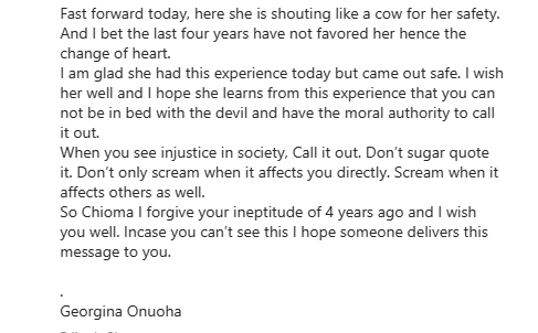 Taking to her Instagram page, Georgina shared a lengthy post calling Chioma out for only speaking up and showing courage because she was directly affected.